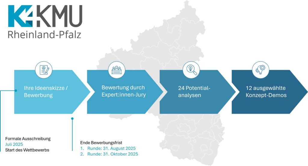 Sie haben eine Idee für eine Anwendung von Künstlicher Intelligenz (KI) in Ihrem Unternehmen oder würden gerne Prozesse digital transformieren – aber Sie sind noch nicht sicher, ob das Potential für die Anwendung gegeben ist? Lassen Sie uns gemeinsam die Idee analysieren! Werden Sie Teil des Projektes KI4KMU-RLP („Erforschung und Transfer nachhaltiger Kl-Innovationen für produzierende KMU in Rheinland-Pfalz“), in dem Unternehmen als Partner gemeinsam mit vier Forschungseinrichtungen in Kaiserslautern KI-Anwendungen auf ihre Potentiale prüfen und Unternehmen eine fundierte Fachbegleitung bei der Realisierung erhalten können. Bewerben Sie sich jetzt mit Ihrer Idee für die KI-Anwendung. Wird Ihre Idee ausgewählt, laden wir Sie zu einer Potentialanalyse ein, die mit einem der Forschungseinrichtungen unseres Projektes (Fraunhofer IESE, Fraunhofer ITWM, DFKI oder der RPTU Kaiserslautern-Landau) durchgeführt wird. Nach der Potentialanalyse erhalten ausgewählte Unternehmen in einem nächsten Schritt die Möglichkeit, dass auch die Entwicklung der innovativen KI-Anwendung von einem wissenschaftlichen Partner unterstützt wird. Nutzen Sie die Chance! Kleine und mittlere Unternehmen mit Sitz in Rheinland-Pfalz können sich ab sofort bis 31.10.2025 mit ihrer Idee bewerben.